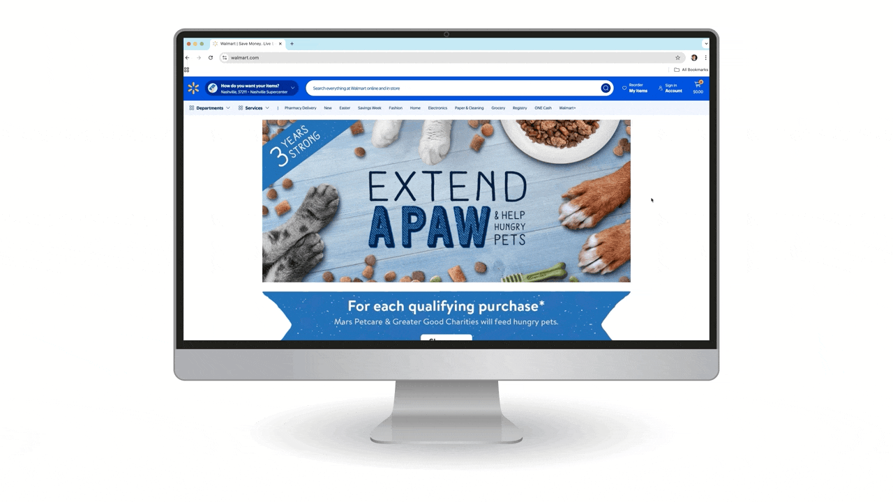 SOLUTION: To address this, we proposed a retailer initiative allowing pet owners to donate a meal with each purchase. This initiative became a Walmart Marketing priority in 2021 and ran for three consecutive years.